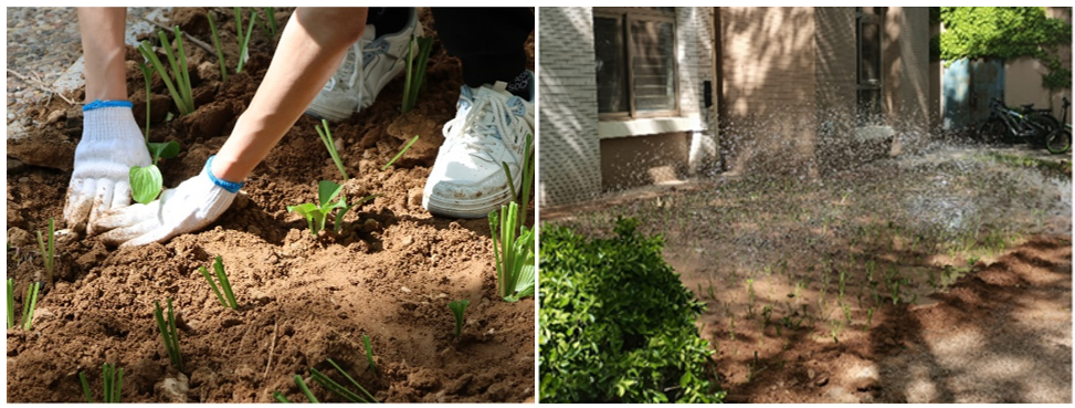 在树影斑驳下、芬芳泥土前,绿化中心种植指导老师为同学们示范标准种植方法,讲解种植技巧。在专业人员的认真教导下,支部党员和同学们戴好手套,握紧锄头,捧起紫萼新苗,正式开始如火如荼的种植工作。