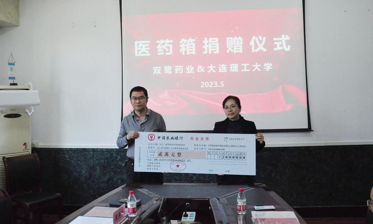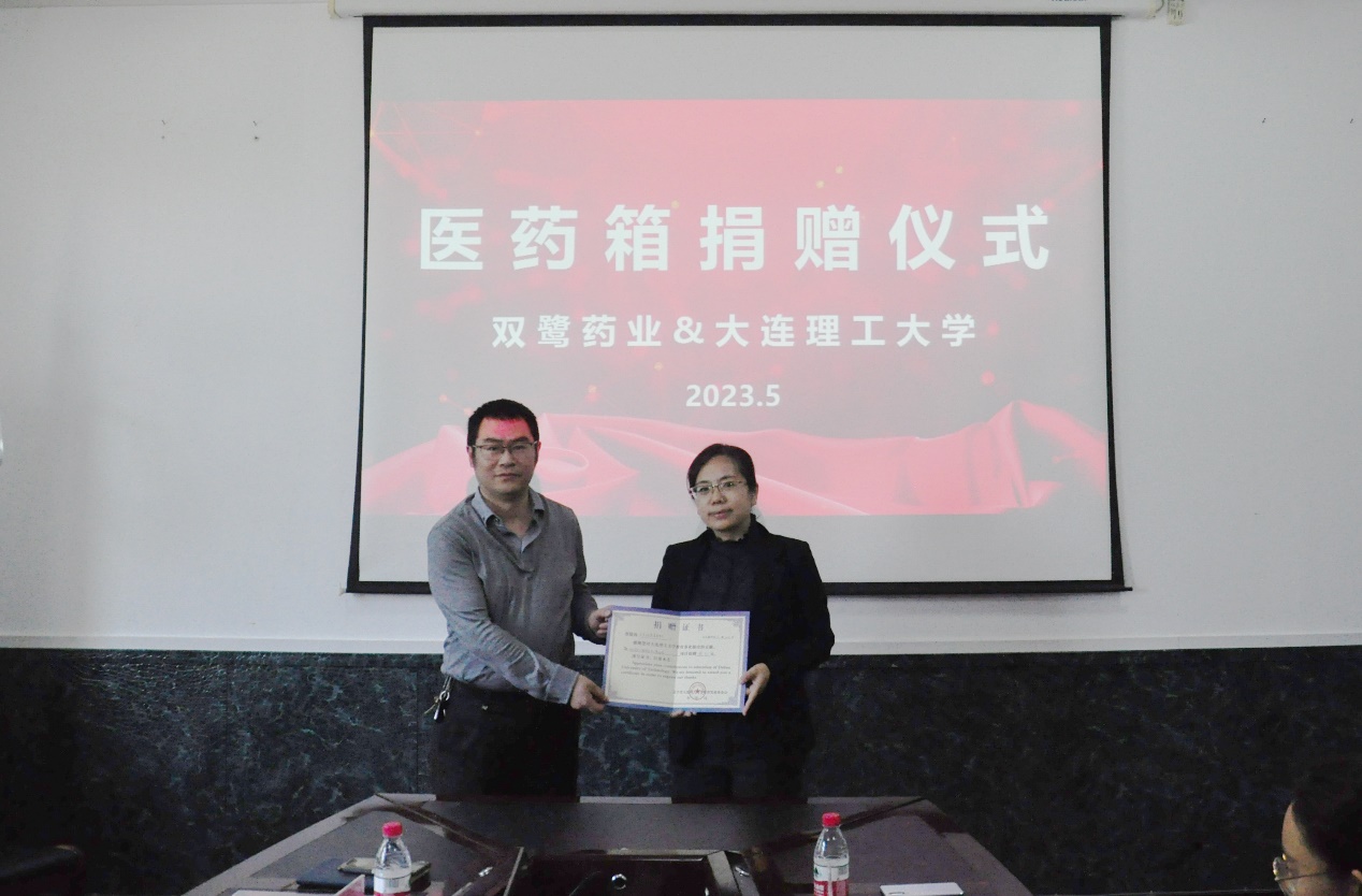 捐赠仪式在与会人员热烈的掌声中拉开帷幕。王涌涛书记代表后勤处接受双鹭药业公司的捐赠,代表学校颁发捐赠证书。王涌涛书记对双鹭药业的捐赠表示感谢,也对促成义举的生物工程学院副院长袁文杰老师表示感谢。袁文杰老师代表双鹭药业简单地介绍了企业的发展历程和取得的成绩,表达了公司推动学校教育发展的初衷和企业回馈社会的应有责任,希望通过捐赠活动,助力大工学子成长成才。双鹭药业长期致力于参加社会公益慈善活动,通过设立的北京立生慈善基金会,为诸多贫困家庭提供免费医药支持。本次捐赠活动为双鹭药业集团首次走进大工,助力学校幸福大工项目建设,为企业进一步参与学校工作高质量发展创造良好机遇。