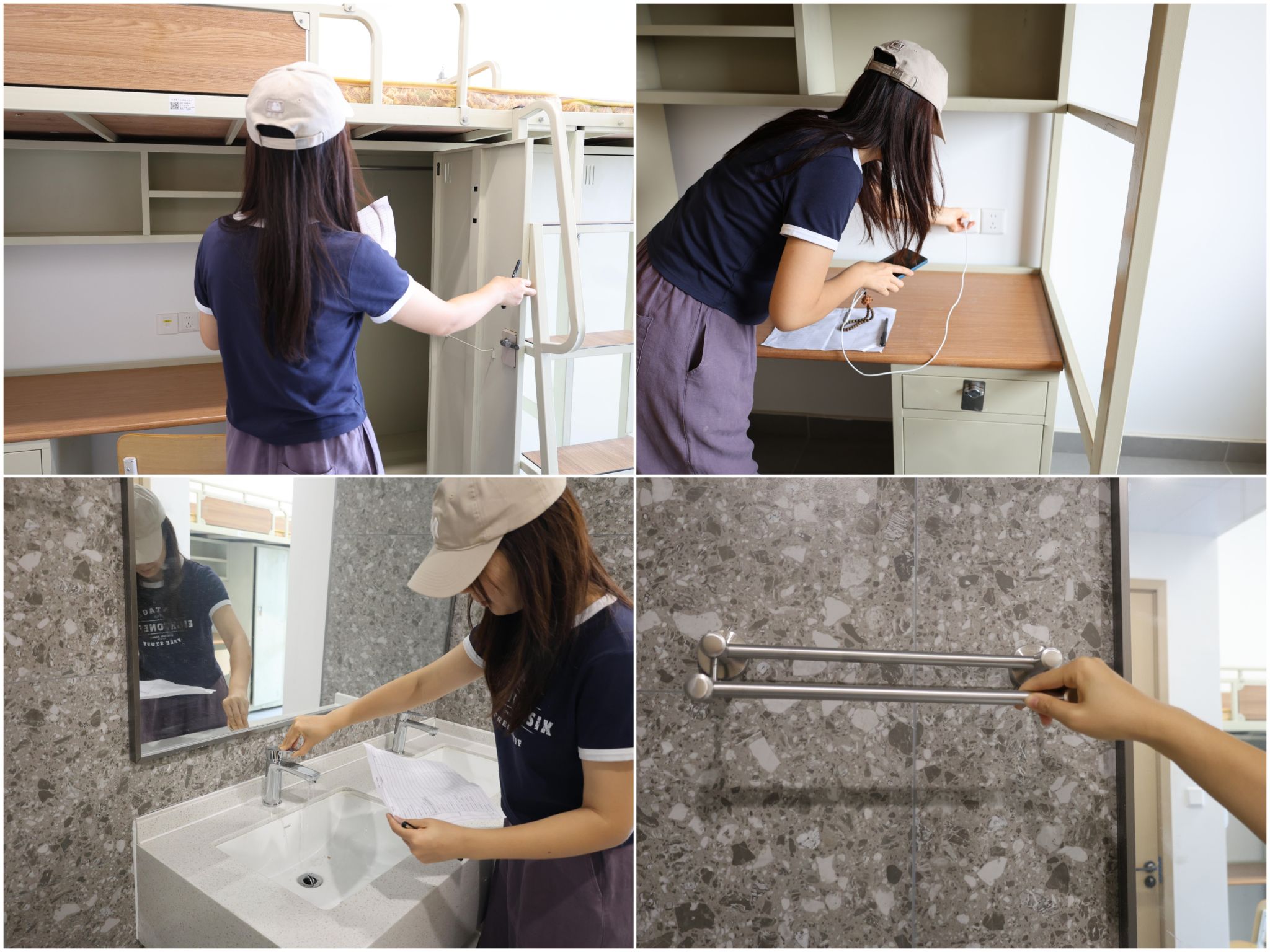 检查团队由后勤各部门、中心的46名人员组成,对4栋公寓的1212个房间展开检查,重点排查地面污渍、家具表面浮尘、卫生间异味等问题,特别关注墙面、玻璃清洁度等细节,确保学生入住即可享受整洁明亮的休息环境。同时,围绕学生高频使用的设施设备开展"全功能测试":从家具安装牢固性、插座通电安全,到空调制冷制热效果、水龙头出水状态,甚至毛巾杆安装等细节均纳入检查范围。针对个别楼宇的旧家具护栏进行加固检查,杜绝安全隐患,让学生使用更放心。备品检查则聚焦窗帘、标志牌等"小而美"的细节,确保每间宿舍都配备完好的生活必需品。检查发现的问题当日汇总整改,通过"即查即改"机制保障学生入住时,设施全部到位、功能区域陆续启用。