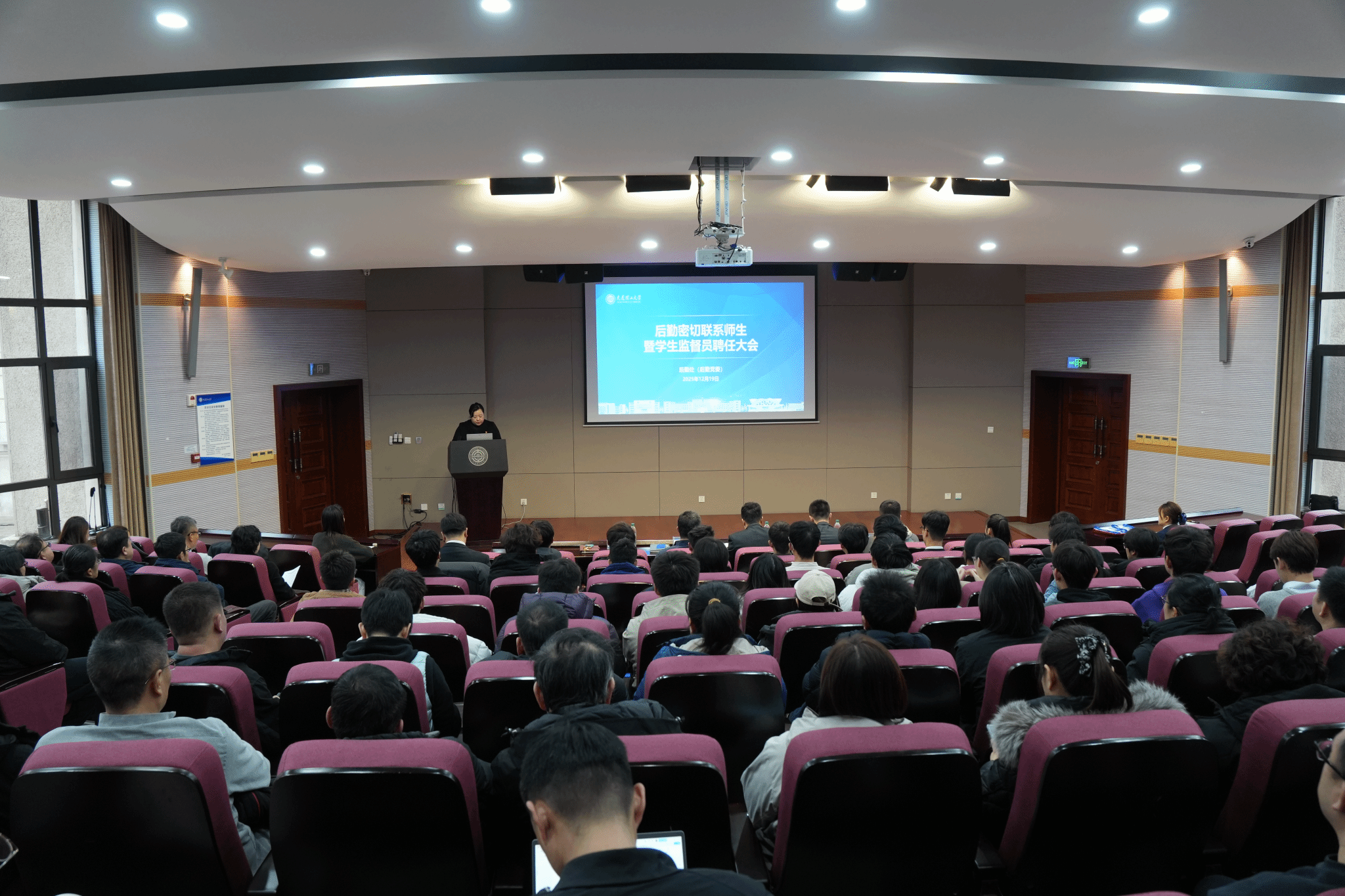 12月19日,主楼第一报告厅格外暖意融融、朝气满满,为落实后勤作风建设与密切联系师生的工作要求,将“三全育人”理念深度融入后勤管理服务全过程,进一步优化后勤内部治理结构,推动后勤服务质量和治理效能双提升,后勤处组织召开后勤密切联系师生暨学生监督员聘任大会,后勤处处长石成田、后勤党委书记杨玉林,校团委书记赵显嵩,后勤全体管理人员与第一届后勤服务学生监督员代表参加此次会议。会议由后勤党委副书记、副处长兼纪委书记田琳主持。