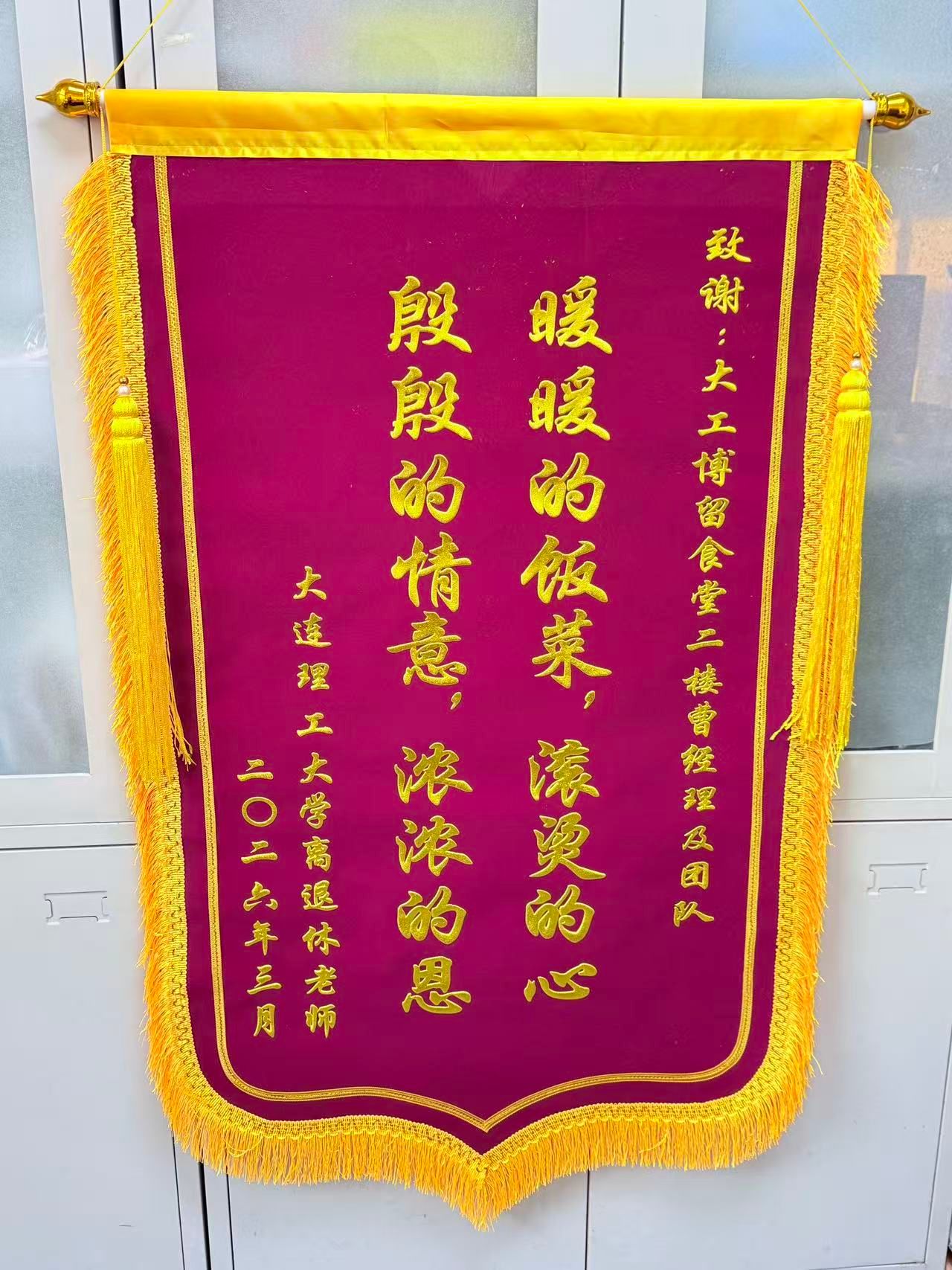 近日,博留食堂二楼收获了一份沉甸甸的礼物——一面来自退休教职工的锦旗。金灿灿的大字写着:“暖暖的饭菜滚烫的心,殷殷的情意浓浓的恩”。